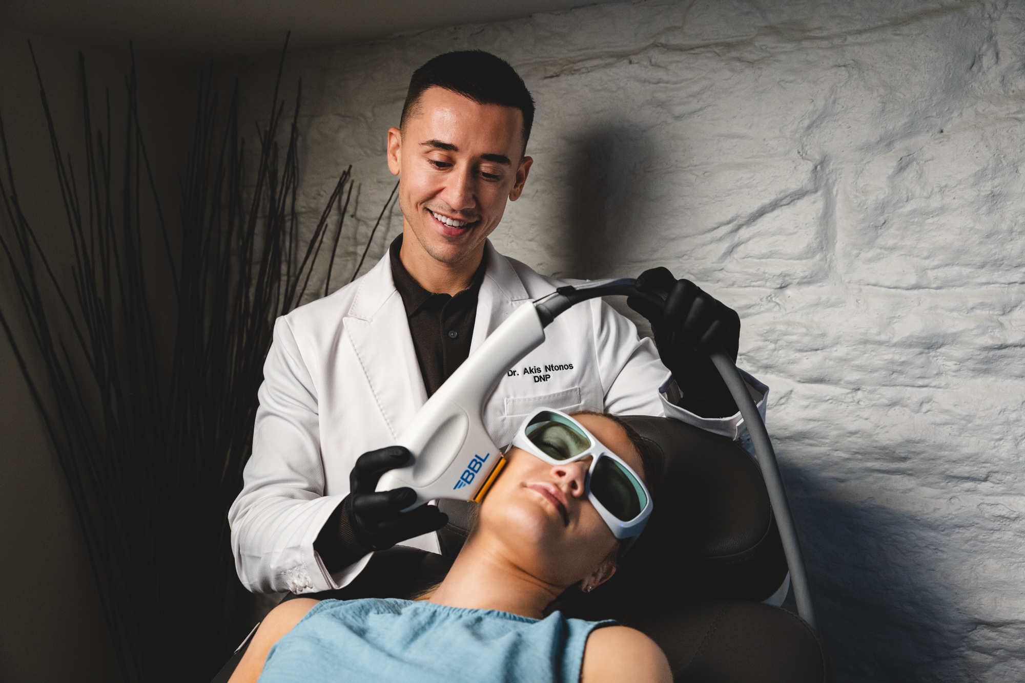 A patient shuts her eyes as an expert provider performs a BBL treatment, which serves as an excellent complement for laser resurfacing in New York City.