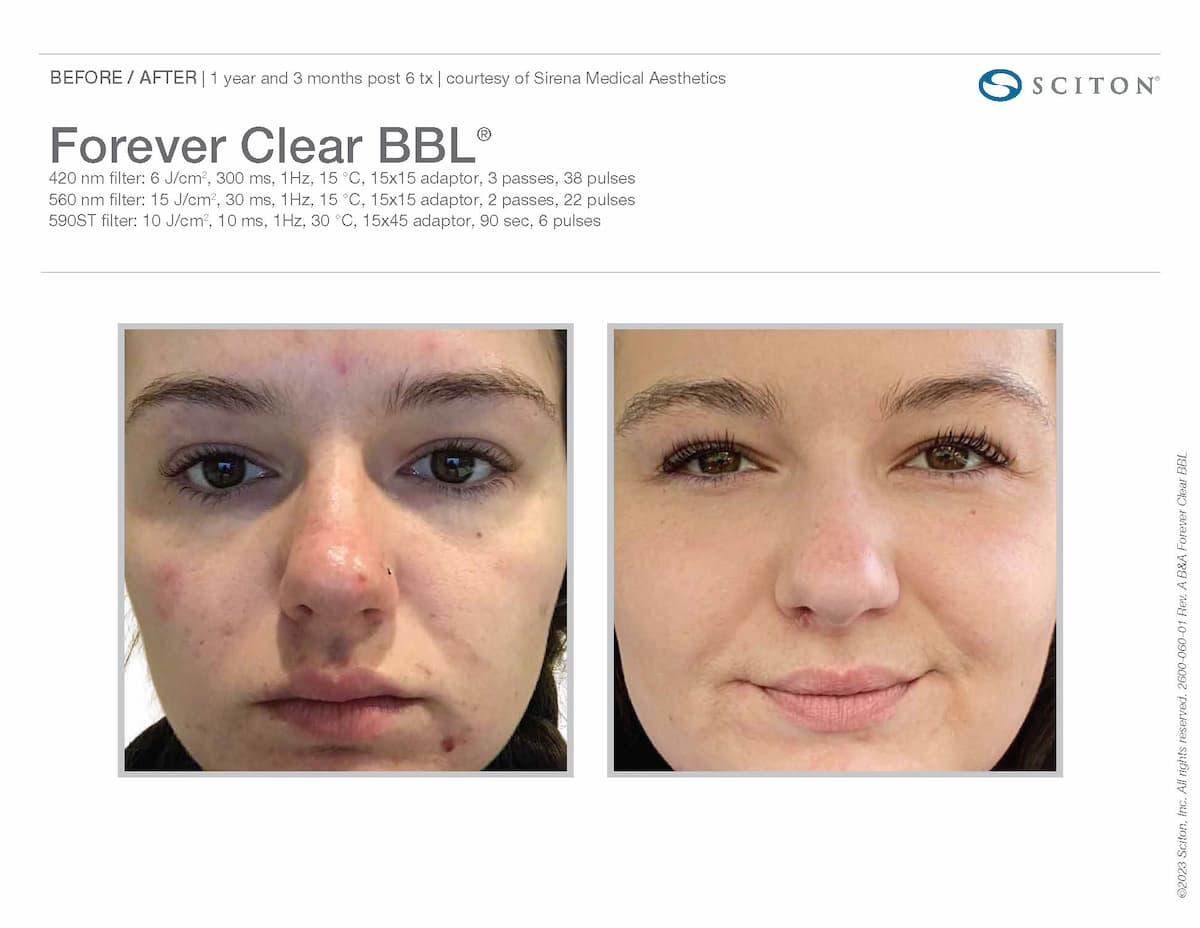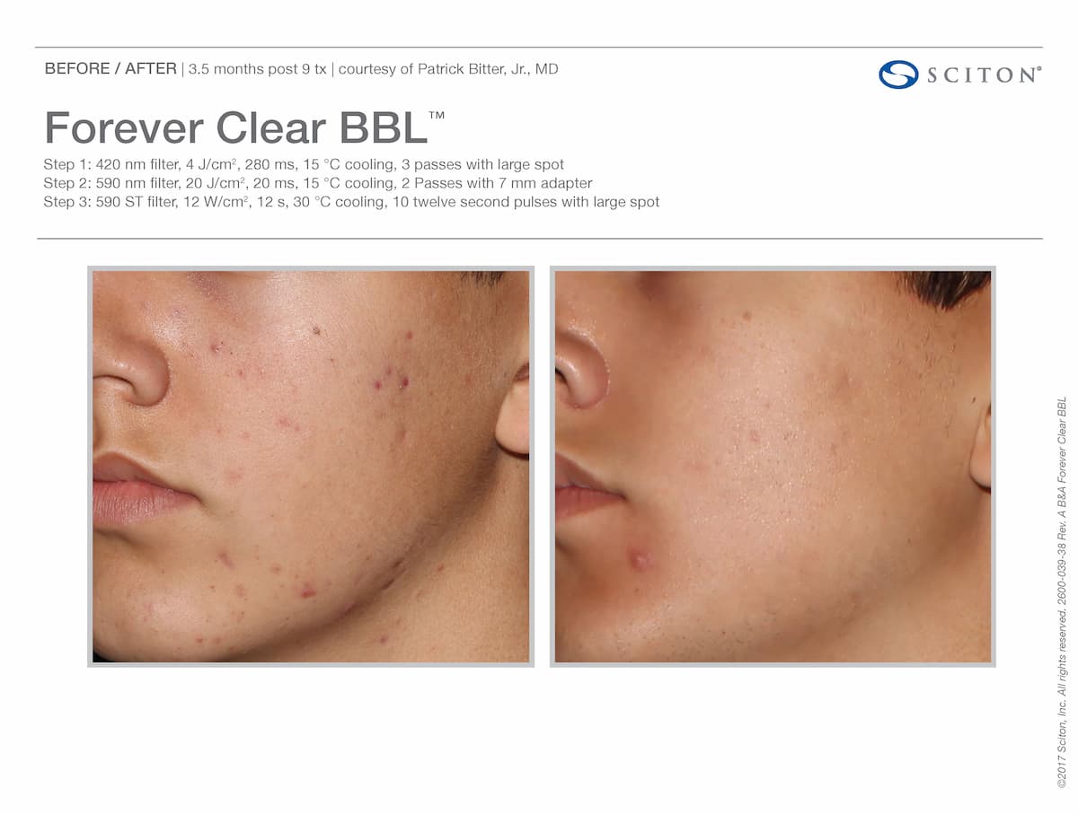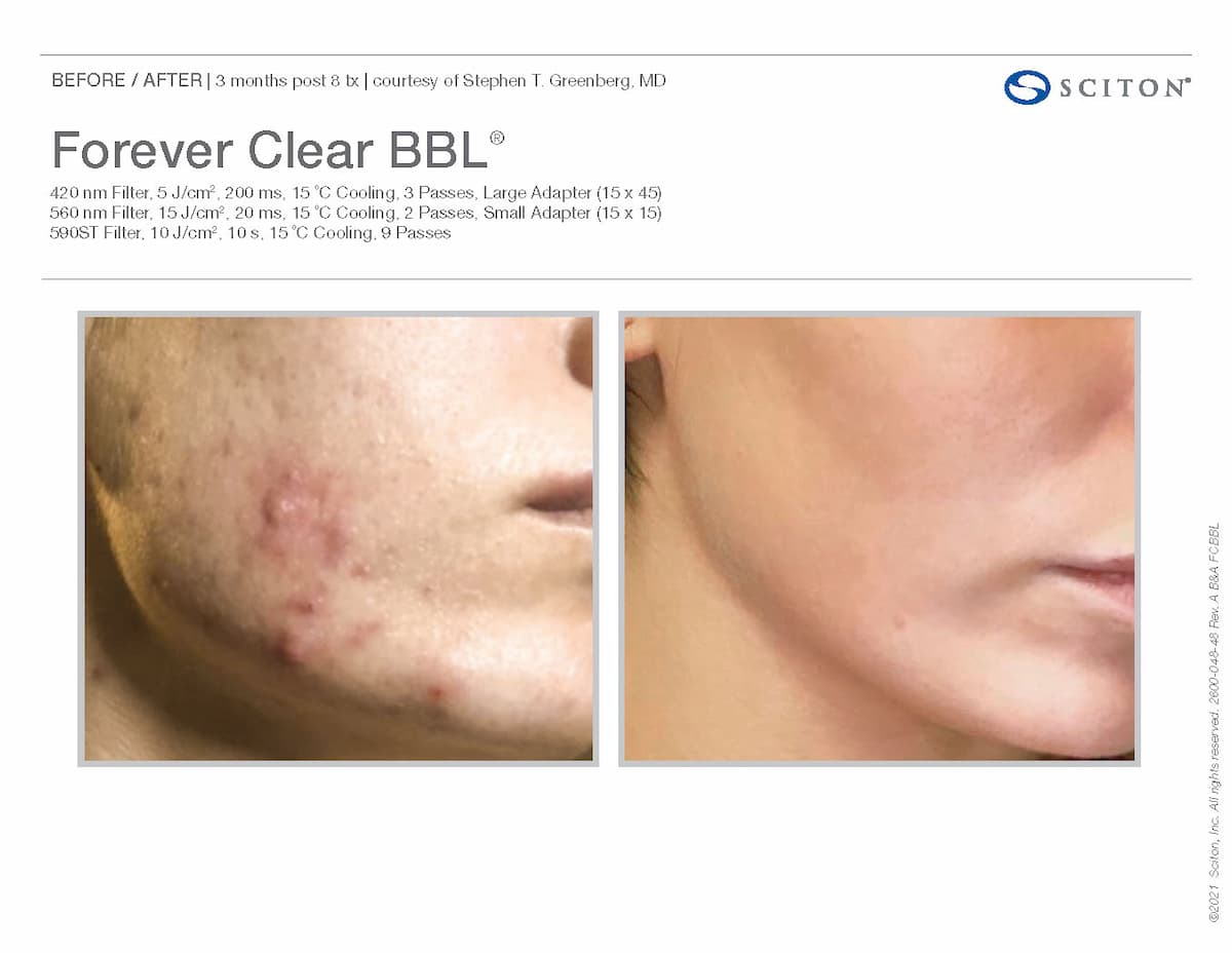 Sciton’s innovative BBL HERO technology powers our Forever Clear BBL treatment in NYC. Going beyond surface-level treatments, we combine light energies to target acne at the source. While blue light kills bacteria and reduces oil, yellow light reduces inflammation, and infrared light activates the skin renewal process.